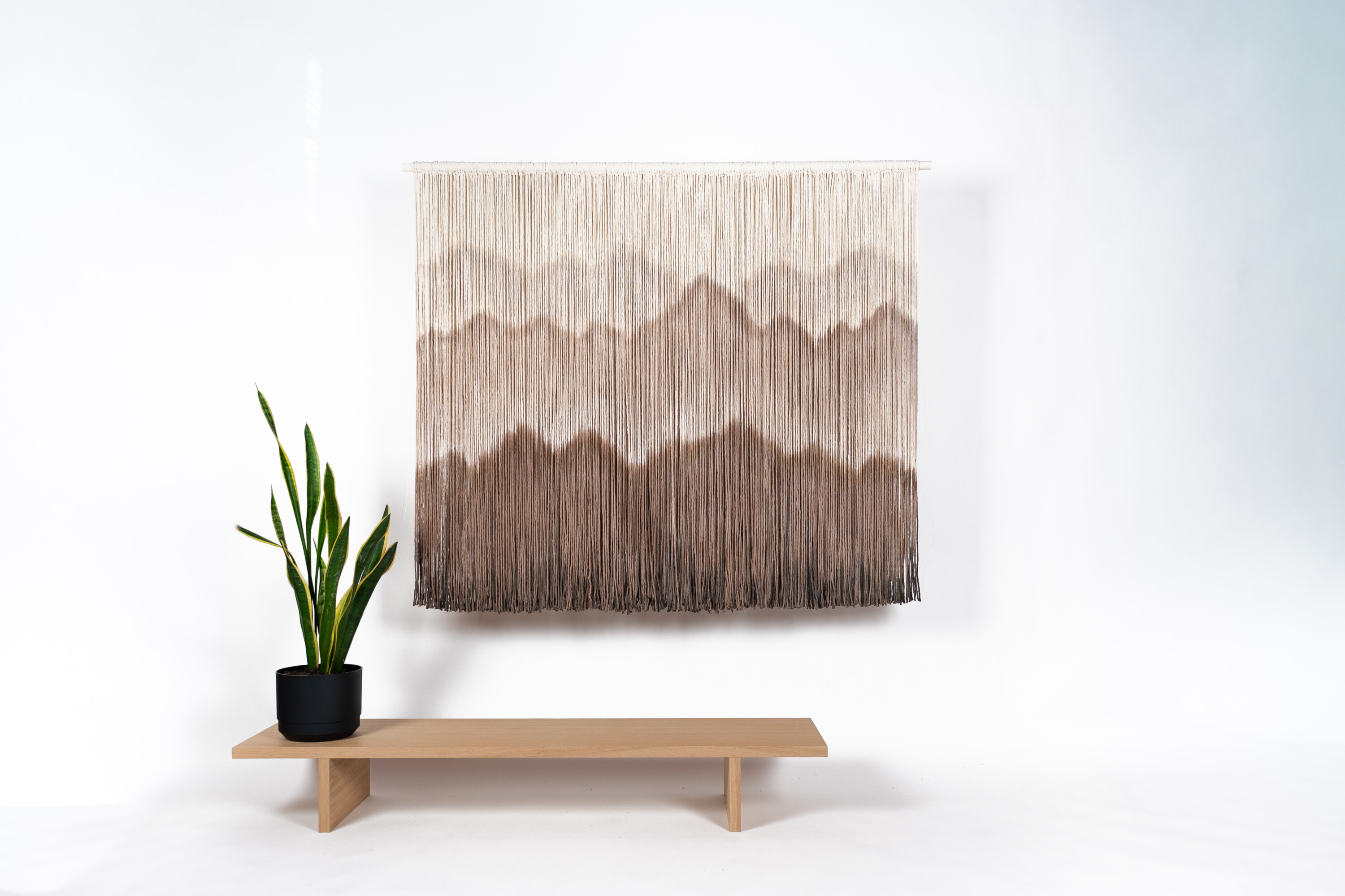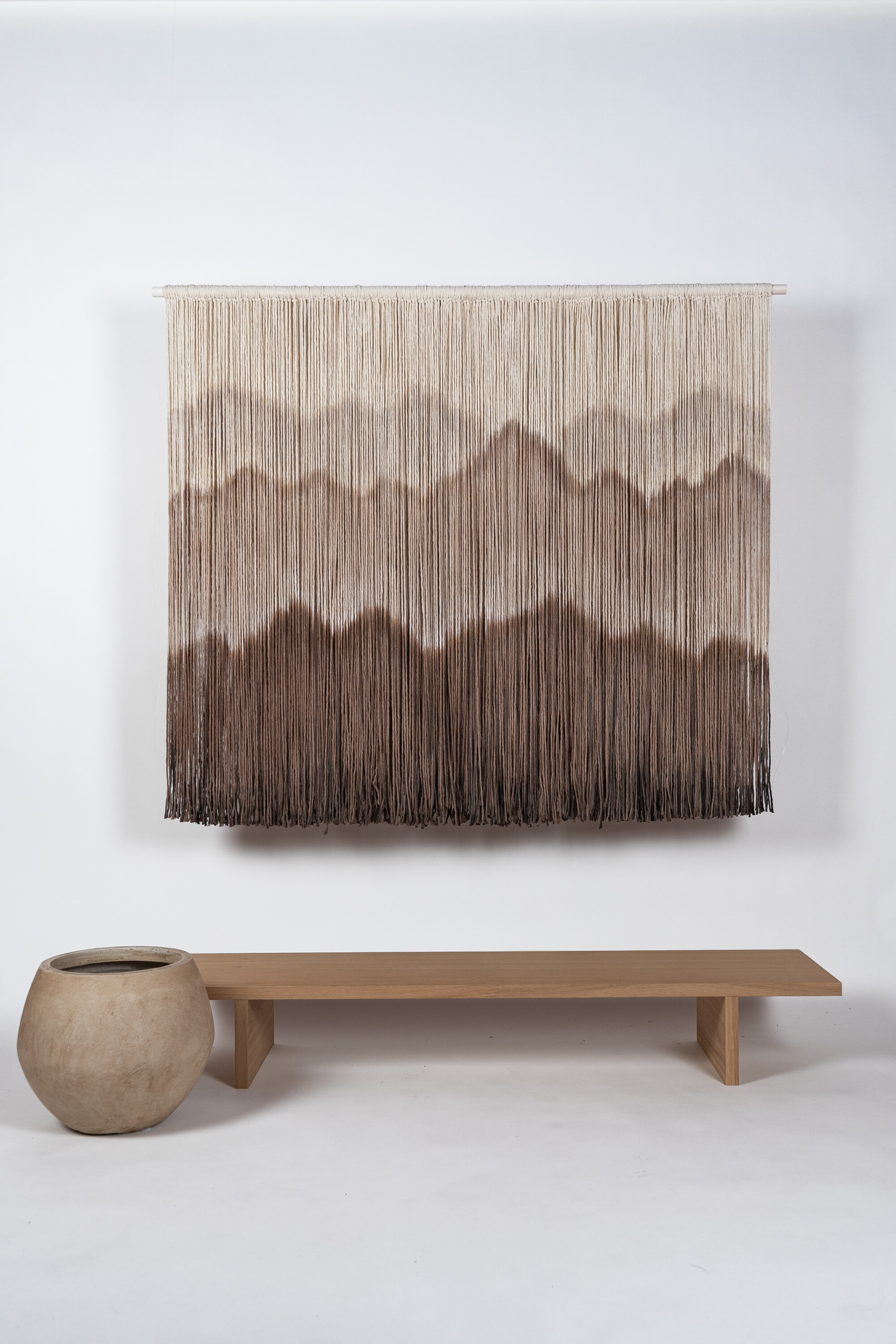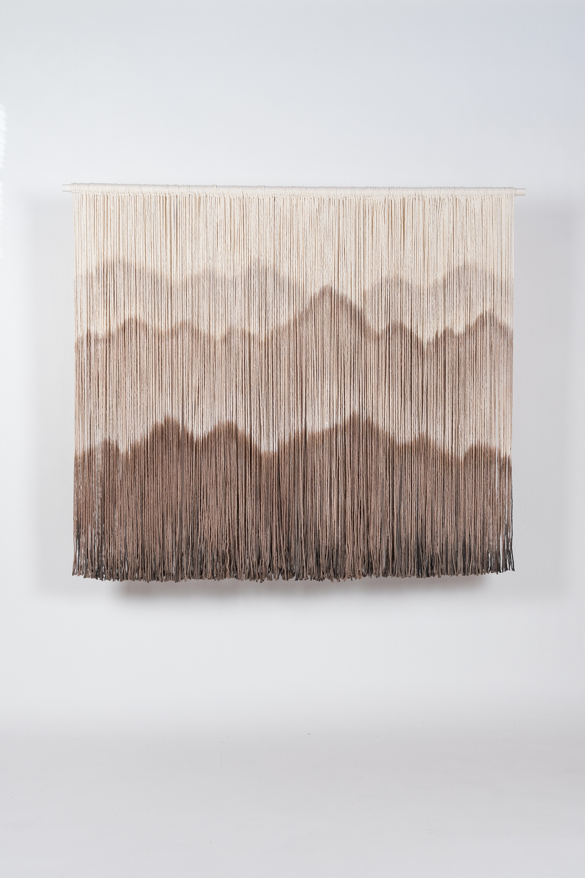 The piece is knotted onto a waxed pine dowel rod. The visible knots emphasize the handcrafted feel. Brown Mountains works as a calm focal point in both home and workspace—bringing texture, depth, and nature-inspired aesthetics to the wall.