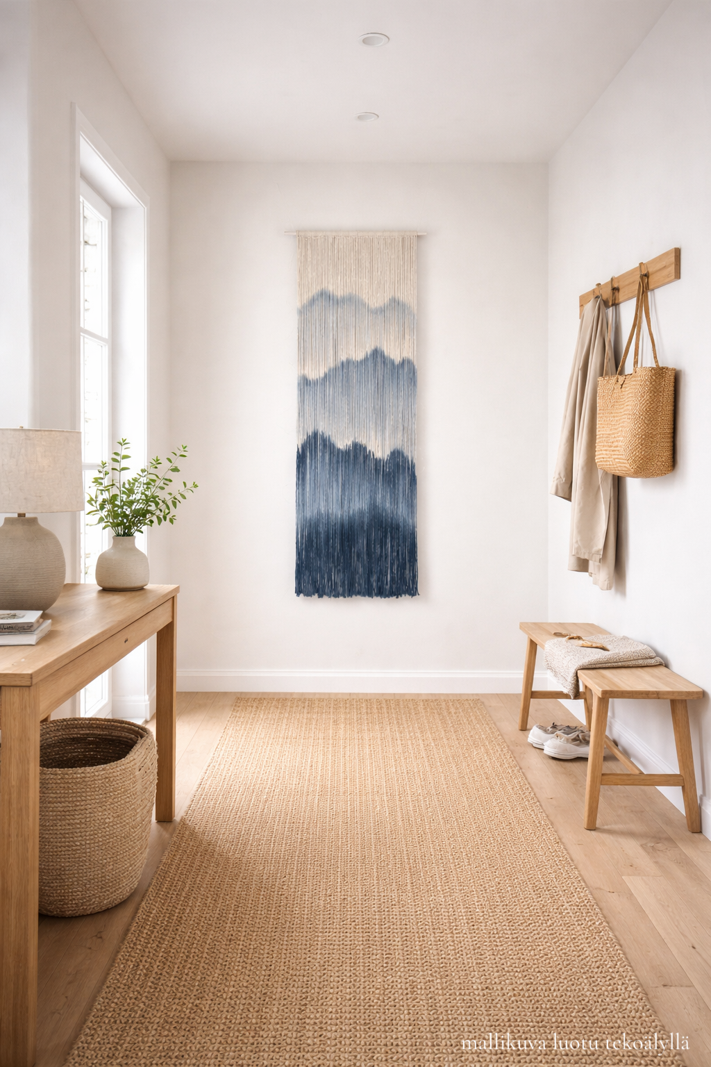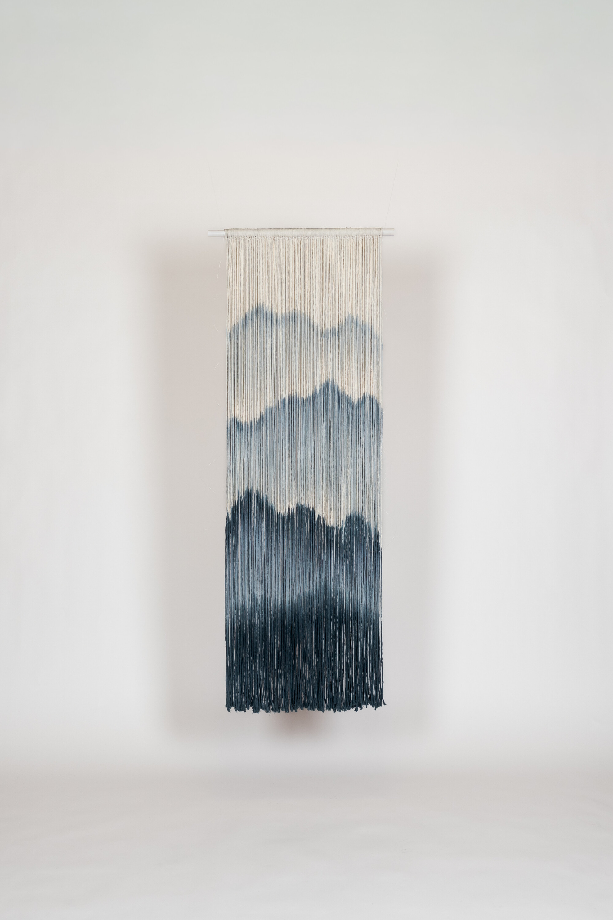 Tämä kapea ja korkea seinävaate on kuin pala rauhallista maisemaa seinällä. Sinisen sävyt liukuvat pehmeästi toisiinsa ja muodostavat vuorimaisen kuvion, joka tuo tilaan levollisuutta ja syvyyttä. Pitkät, vapaasti laskeutuvat langat tekevät teoksesta elävän. Se näyttää aina vähän erilaiselta valon ja liikkeen mukaan.